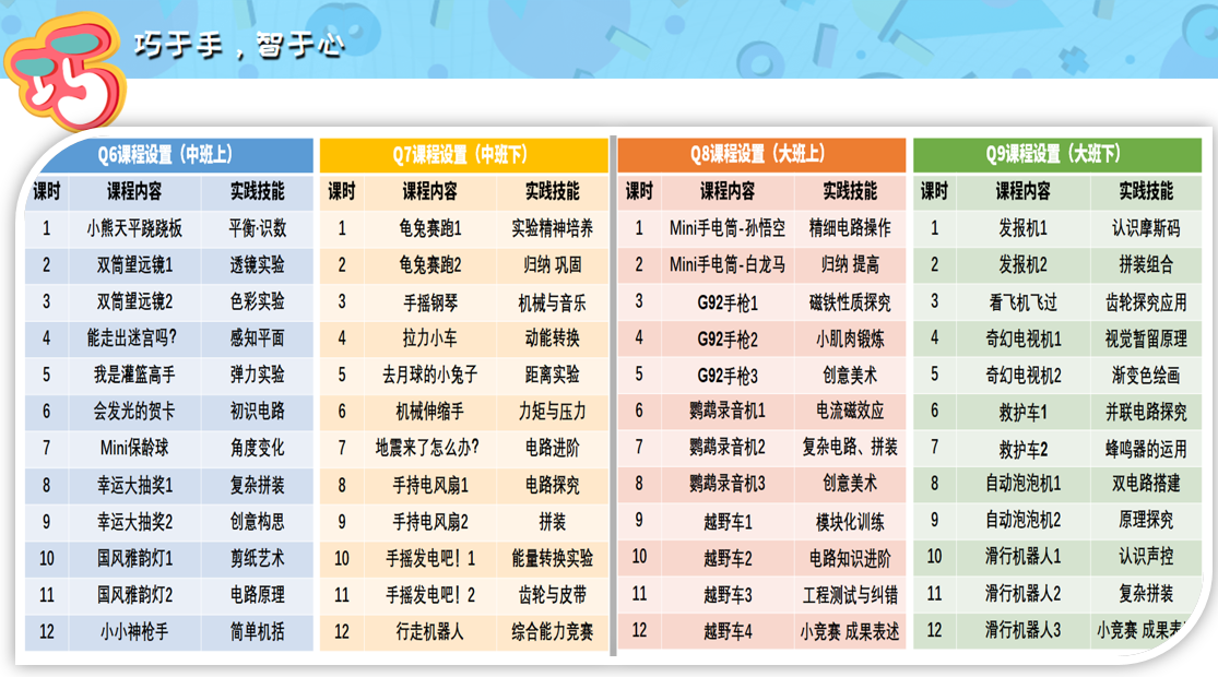 在课程实践中,通过引导孩子从分类排放零件,分步探究, 分块组装入手,潜移默化的帮助孩子养成分类好习惯,培养孩子 的计划能力,这样,做事才会更加有条理。